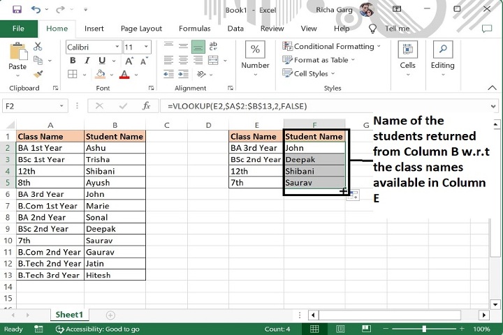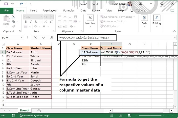 在上式中,E2 是要在主列中查詢其值的條件單元格,A2:A13 是要在其中查詢 E 列值的主列範圍,2 是要返回其值的 B 列的索引號,False 用於獲取學生姓名的精確匹配。