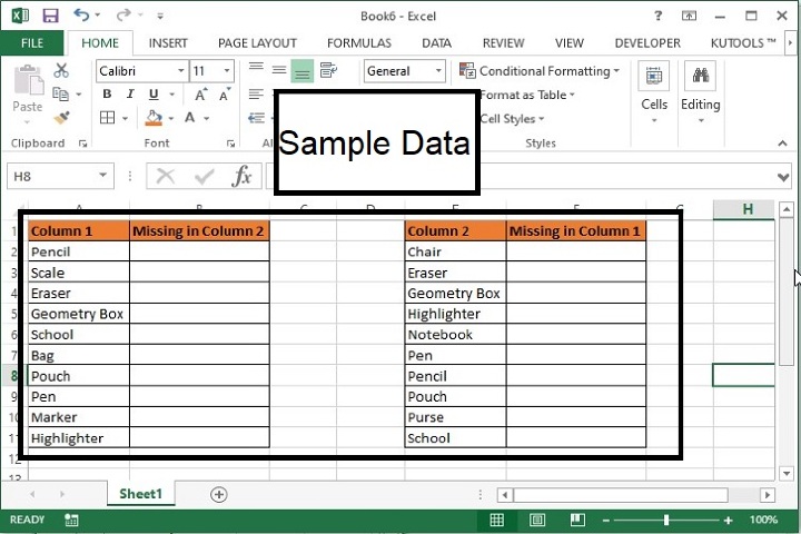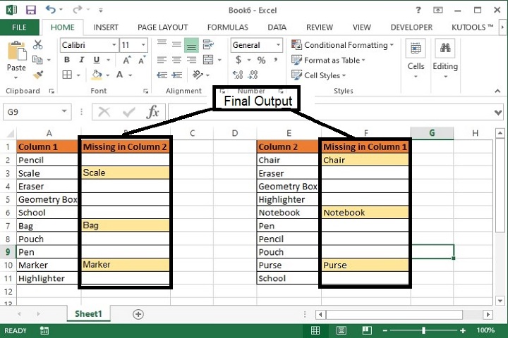 在這裡,我們在兩列中輸入了一些資料,並且針對每一列,另一列中的缺失項將被突出顯示。