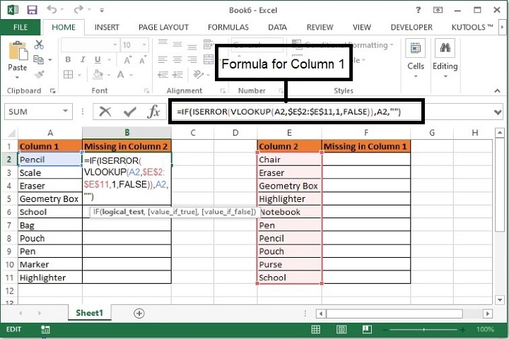 步驟 4 − 類似地,在名為“列 1 中缺失”的列中輸入以下公式。