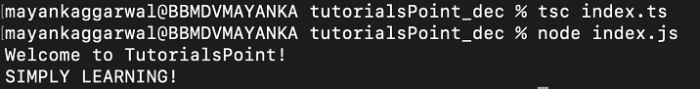 var greet : string = "Welcome to"; var org : string = "TutorialsPoint!"; var tagLine : string = "SIMPLY LEARNING!" console.log(greet+ " "+org ); console.log(tagLine);