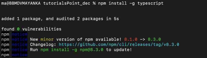 安裝 Node 和 NPM 後,我們需要在系統上安裝TypeScript。