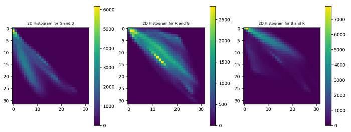 在這個 Python 程式中,我們計算並繪製輸入影像的三種組合(藍色和綠色、綠色和紅色以及紅色和藍色)顏色的二維直方圖。