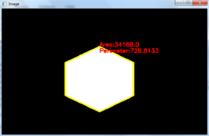 import cv2 # Read the input image img = cv2.imread('pentagon.png') # convert the image to grayscale gray = cv2.cvtColor(img, cv2.COLOR_BGR2GRAY) # Apply thresholding in the gray image to create a binary image ret,thresh = cv2.threshold(gray,150,255,0) # Find the contours using binary image contours,hierarchy = cv2.findContours(thresh, cv2.RETR_TREE,cv2.CHAIN_APPROX_SIMPLE) print("Number of contours in image:",len(contours)) cnt = contours[0] # compute the area and perimeter area = cv2.contourArea(cnt) perimeter = cv2.arcLength(cnt, True) perimeter = round(perimeter, 4) print('Area:', area) print('Perimeter:', perimeter) img1 = cv2.drawContours(img, [cnt], -1, (0,255,255), 3) x1, y1 = cnt[0,0] cv2.putText(img1, f'Area:{area}', (x1, y1), cv2.FONT_HERSHEY_SIMPLEX, 0.6, (0, 0, 255), 2) cv2.putText(img1, f'Perimeter:{perimeter}', (x1, y1+20), cv2.FONT_HERSHEY_SIMPLEX, 0.6, (0, 0, 255), 2) cv2.imshow("Image", img) cv2.waitKey(0) cv2.destroyAllWindows()