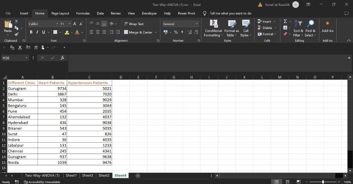 步驟 1 - 在工作表中建立資料集,第一列表示多個城市的名稱,第二列包含包含心臟病患者人數的第一個樣本資料,第三列表示代表高血壓患者人數的第二個樣本資訊。在應用 Z 檢驗之前,我們必須計算不同樣本的方差。