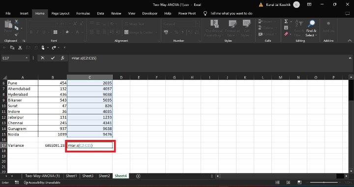 步驟 3 - 同樣,計算第二個樣本的方差。輸入方差公式=VAR.S(C2:C15) 並按Enter 鍵。