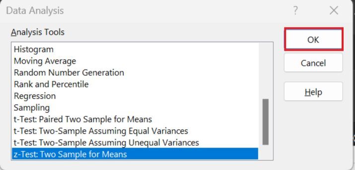 步驟 5 - 將出現另一個名為資料分析的對話方塊。從該對話方塊的下拉選單中選擇Z 檢驗:雙樣本均值,然後按確定按鈕。