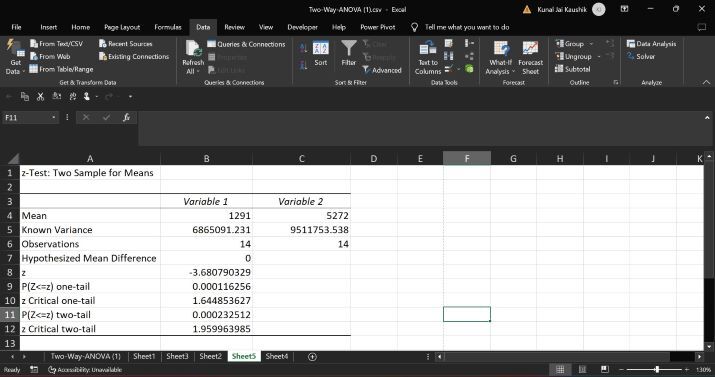 觀察 Z 檢驗表後,單尾 P(Z<=z) 值 0.000116256 小於 0.05,雙尾 P(Z<=z) 值 0.00023512 也小於 0.05,這意味著我們必須接受備擇假設並拒絕零假設。