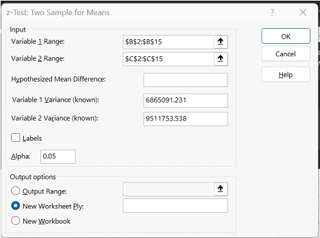步驟 6 - 在變數 1 區域和變數 2 區域標籤的前面分別寫入第一個資料集和第二個資料集的範圍。輸入我們在步驟 2 和步驟 3 中計算的方差 1 和方差 2 的值。將 Alpha 值設定為 0.05。在輸出選項部分,使用者可以選擇任何選項。在這裡,我們選擇新建工作表 Ply: 選項,這意味著輸出將在新工作表中生成。