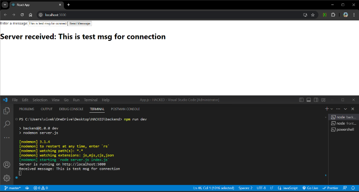 執行前端和後端伺服器後,我們可以看到我們在前端輸入和傳送的訊息已在後端終端接收。