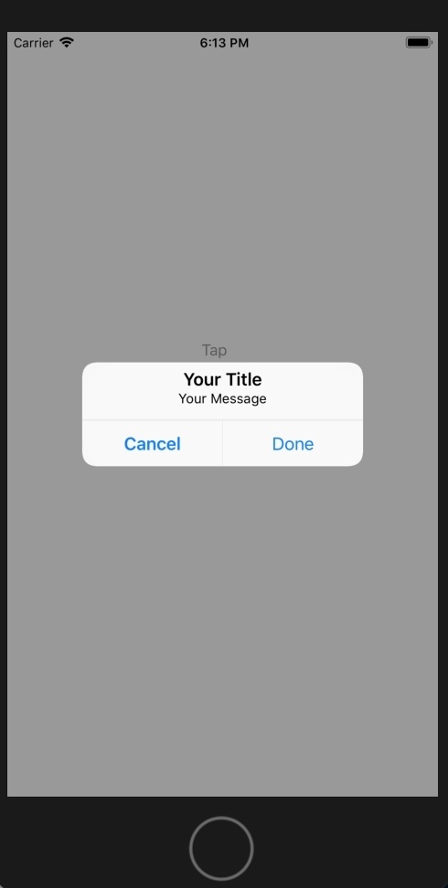 let cancel = UIAlertAction(title: "Cancel", style: .cancel, handler: nil) alert.addAction(cancel) let OKAY = UIAlertAction(title: "Done", style: .default, handler: nil) alert.addAction(OKAY) self.present(alert, animated: true, completion: nil)