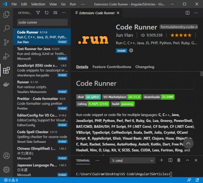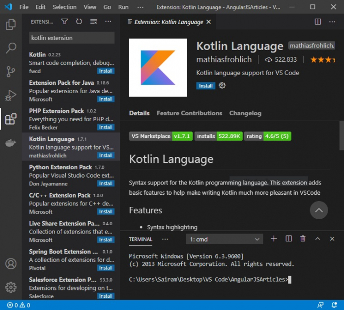 轉到“擴充套件”部分並安裝“Kotlin 語言支援 for VS Code”和“Code Runner”。我們需要這兩個擴充套件程式才能在 VS Code 環境中執行 Kotlin。