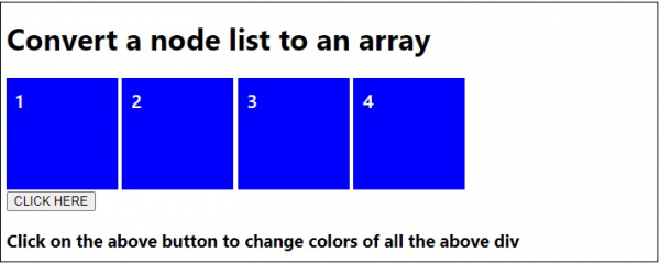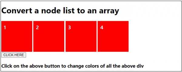 <!DOCTYPE html> <html lang="en"> <head> <meta charset="UTF-8" /> <meta name="viewport" content="width=device-width, initial-scale=1.0" /> <title>Document</title> <style> body { font-family: "Segoe UI", Tahoma, Geneva, Verdana, sans-serif; } .sample { display: inline-block; font-size: 20px; font-weight: 500; color: white; background-color: blue; padding:10px; width: 100px; height: 100px; } </style> </head> <body> <h1>Convert a node list to an array</h1> <div class="sample">1</div> <div class="sample">2</div> <div class="sample">3</div> <div class="sample">4</div> <br> <button class="Btn">CLICK HERE</button> <h3>Click on the above button to change colors of all the above div </h3> <script> let sampEle = document.querySelectorAll('.sample'); let BtnEle = document.querySelector('.Btn'); BtnEle.addEventListener('click',()=>{ Array.from(sampEle).forEach(item=>{ item.style.backgroundColor = 'red'; }) }) </script> </body> </html>