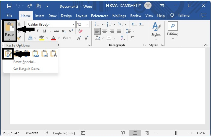 現在轉到Word文件,然後單擊“開始”下的“貼上”,然後選擇下圖所示的任何一種貼上樣式。