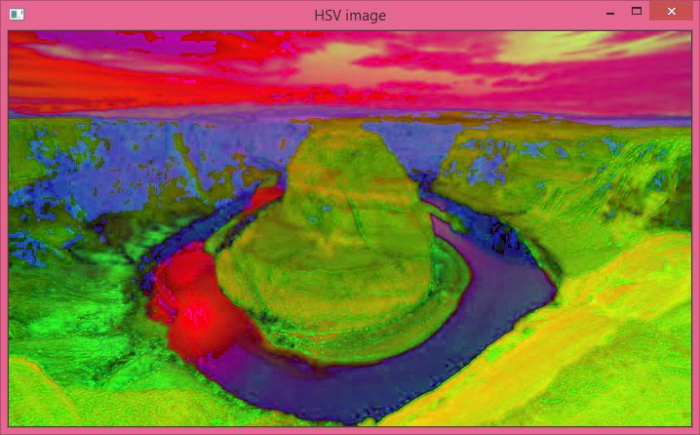 import cv2 # read the input RGB image as BGR format bgr_img = cv2.imread('water.jpg') # Convert the BGR image to HSV Image hsv_img = cv2.cvtColor(bgr_img, cv2.COLOR_BGR2HSV) cv2.imwrite('hsv_image.jpg', hsv_img) # Display the HSV image cv2.imshow('HSV image', hsv_img) cv2.waitKey(0) cv2.destroyAllWindows()