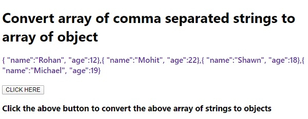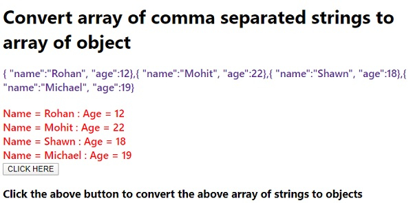 <!DOCTYPE html> <html lang="en"> <head> <meta charset="UTF-8" /> <meta name="viewport" content="width=device-width, initial-scale=1.0" /> <title>Document</title> <style> body { font-family: "Segoe UI", Tahoma, Geneva, Verdana, sans-serif; } .result,.sample { font-size: 18px; font-weight: 500; color: rebeccapurple; } .result { color: red; } </style> </head> <body> <h1>Convert array of comma separated strings to array of object</h1> <div class="sample"></div> <br /> <div class="result"></div> <button class="Btn">CLICK HERE</button> <h3>Click the above button to convert the above array of strings to objects</h3> <script> let BtnEle = document.querySelector(".Btn"); let resEle = document.querySelector(".result"); let sampleEle = document.querySelector(".sample"); let arr = [ '{ "name":"Rohan", "age":12}', '{ "name":"Mohit", "age":22}', '{ "name":"Shawn", "age":18}', '{ "name":"Michael", "age":19}', ]; sampleEle.innerHTML = arr; BtnEle.addEventListener("click", () => { arr.forEach((item, index) => { arr[index] = JSON.parse(item); }); arr.forEach((item) => { resEle.innerHTML += "Name = " + item.name + " : Age = " + item.age + "<br>"; }); }); </script> </body> </html>