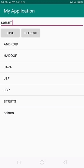 </LinearLayout>在上面的程式碼中,我們使用了姓名和記錄編號作為編輯文字,當用戶點選儲存按鈕時,它會將資料儲存到陣列列表中。點選重新整理按鈕以獲取列表檢視的更改。
