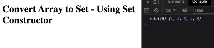 <html> <head> <title>Convert Array to Set - Using Set Constructor</title> <script> const array = [1, 2, 3, 3, 4, 5]; const set = new Set(array); console.log(set); // Output: Set {1, 2, 3, 4, 5} </script> </head> <body> <h1>Convert Array to Set - Using Set Constructor</h1> </body> </html>
