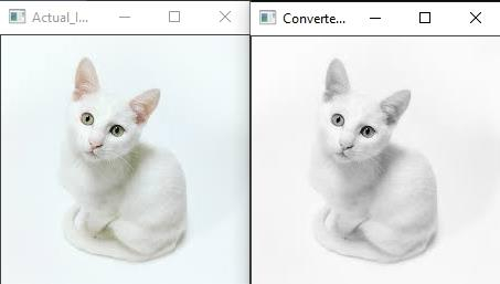 首先,我們聲明瞭兩個矩陣和兩個視窗。這些用於載入和顯示影像。然後我們將名為“cat.jpg”的影像載入到**'myImage'**矩陣中。之後我們使用了**'cvtColor(myImage, myImage_Converted, COLOR_RGB2GRAY)'**。此行將'myImage'的RGB顏色空間轉換為灰度,並將其儲存在'myImage_Converted'矩陣中。