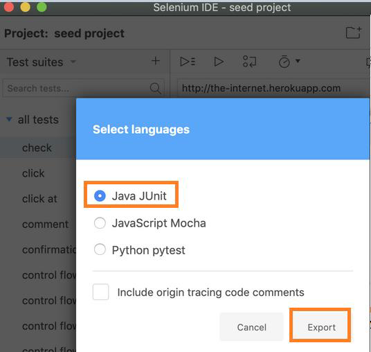 類似的步驟可以用來將相同的命令轉換為其他語言,如 Python、C# 等。另一種將測試轉換為 Java 的方法是右鍵單擊測試,然後選擇**匯出**選項。