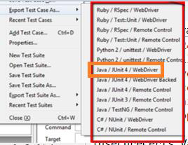 單擊它後,將顯示所有可能的轉換選項。選擇**Java/ Junit 4/ WebDriver**選項。