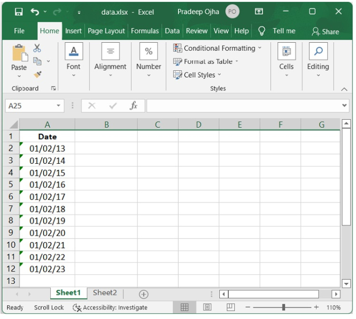 如果將具有兩位數年份的日期輸入單元格,或者從另一個源將資料匯入 Excel,而這些資料先前已格式化為文字,則您可能會在單元格的左上角看到一個小綠色三角形。根據此錯誤訊號,日期正在以文字格式記錄,如下面的螢幕截圖所示。