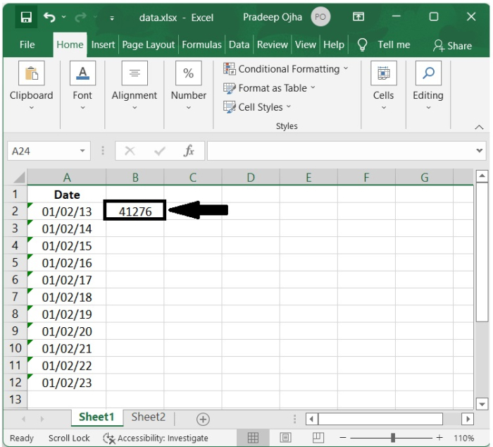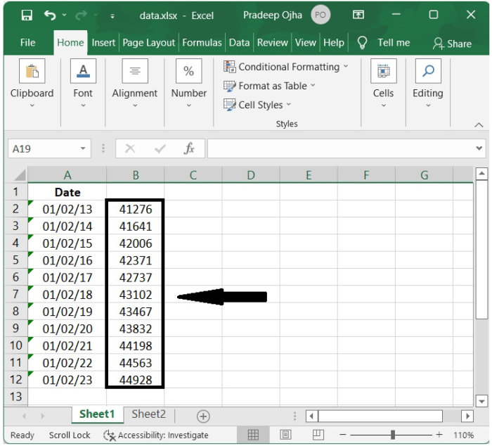 步驟 3 - 然後根據需要拖動此單元格的自動填充柄,以將所有文字日期轉換為 5 位數字。
