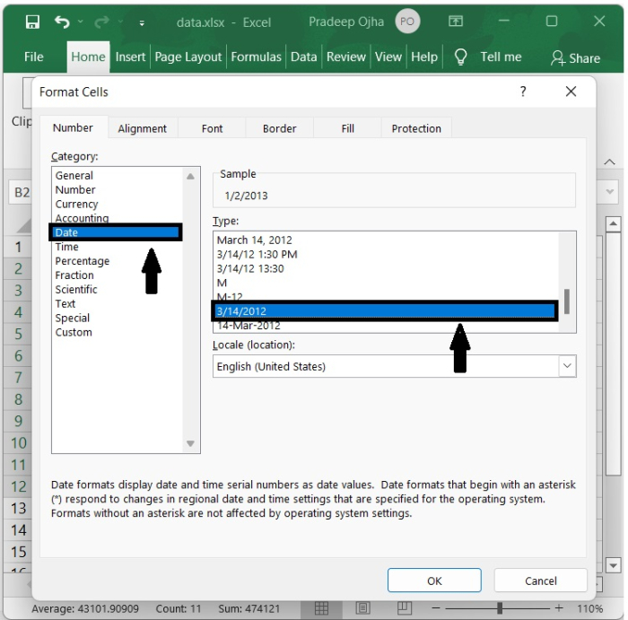 步驟 5 - 在對話方塊中,從“類別”列表中選擇“日期”選項,然後從右側部分的“型別”列表中選擇所需的日期格式,如下面的螢幕截圖所示 -