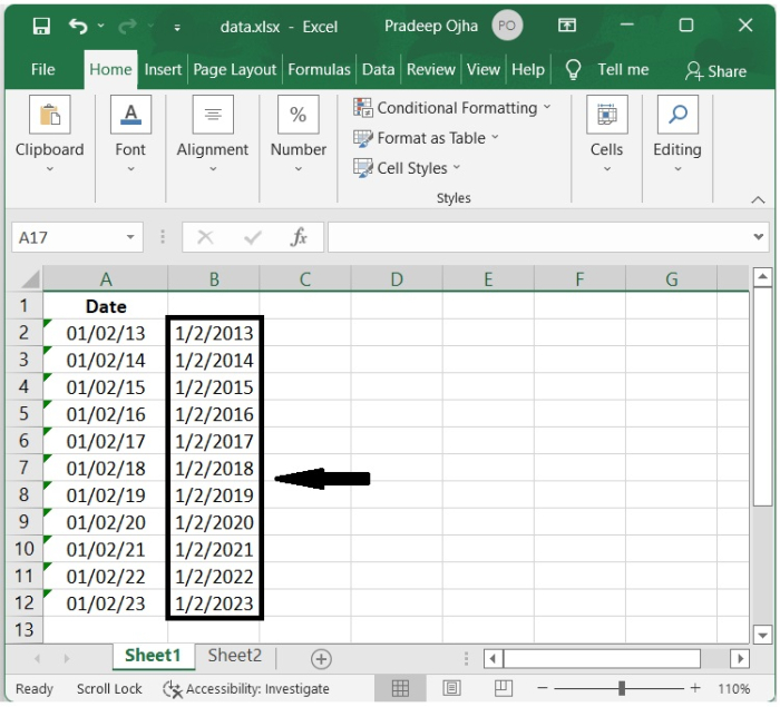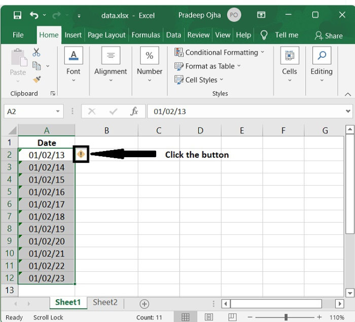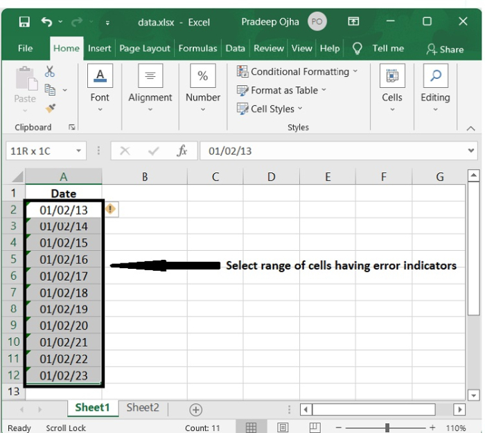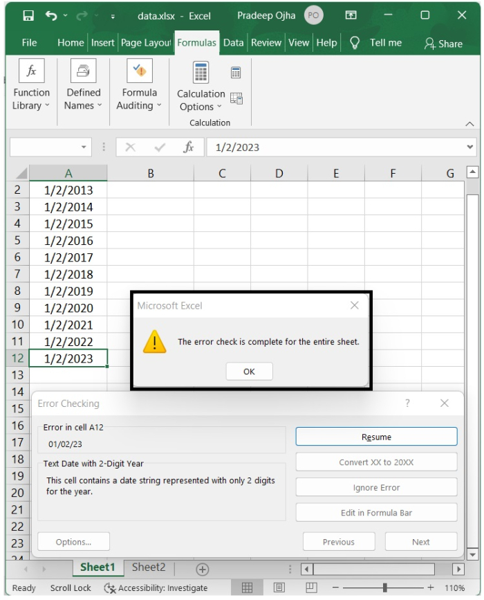 我們還可以使用以下步驟,透過錯誤檢查實用程式將具有兩位數年份的文字日期轉換為具有四位數年份的標準日期格式。