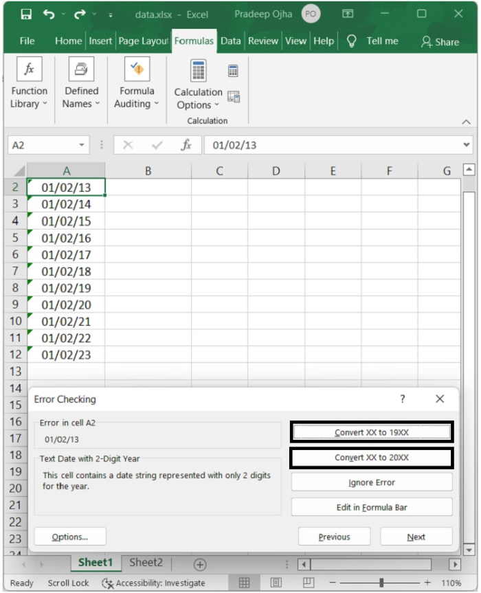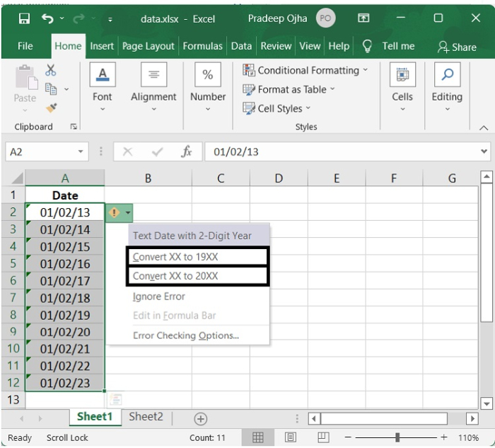 步驟 3 - 單擊錯誤選項後,您將獲得各種選項,如下面的螢幕截圖所示。單擊“將 XX 轉換為 20XX”或“將 XX 轉換為 19XX”以根據您的需要將兩位數年份文字日期格式轉換為日期格式。