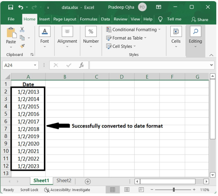 在本例中,我們選擇了“將 XX 轉換為 20XX”選項,並且已成功將具有兩位數年份的文字日期轉換為具有四位數年份的標準日期格式,如下所示。