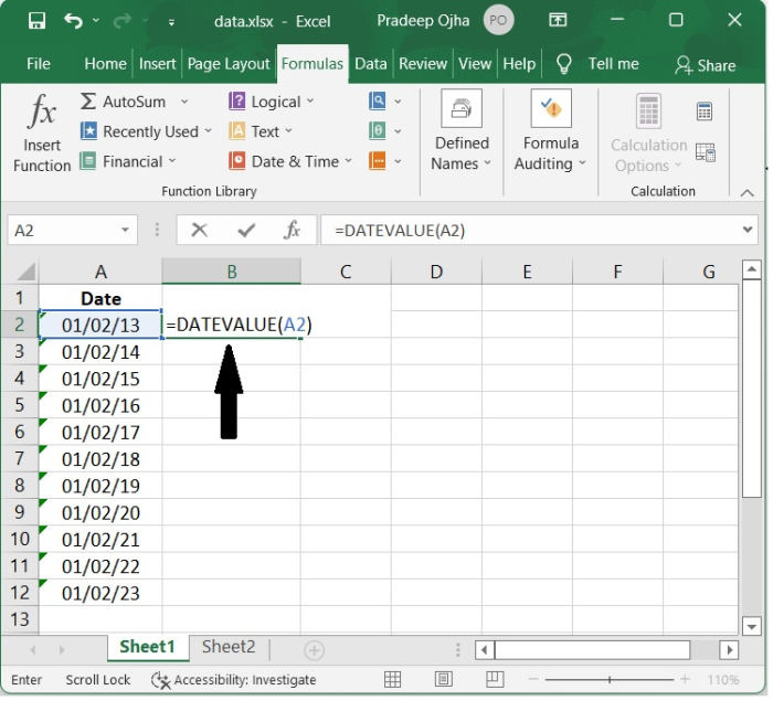 步驟 1 - 選擇文字日期旁邊的空白單元格。在空白單元格中,鍵入此公式 =DATEVALUE(並選擇包含文字日期的單元格)。在本例中,我們選擇了空白單元格 B2。
