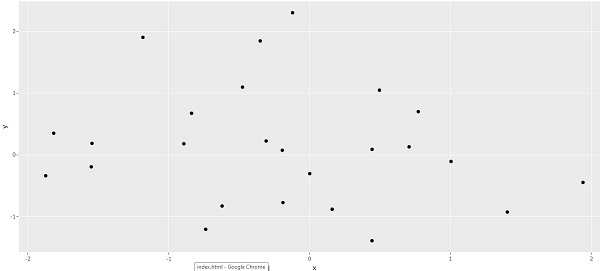 x<-rnorm(25) y<-rnorm(25) df<-data.frame(x,y) library(ggplot2) Plot<-ggplot(df,aes(x,y))+geom_point() library(plotly) ggplotly(Plot)