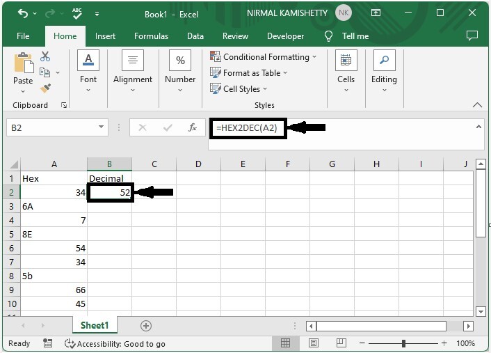 我們可以使用公式=DEC2HEX(A2)將任何十進位制數轉換為十六進位制數。在公式中,A2是我們的值的地址。