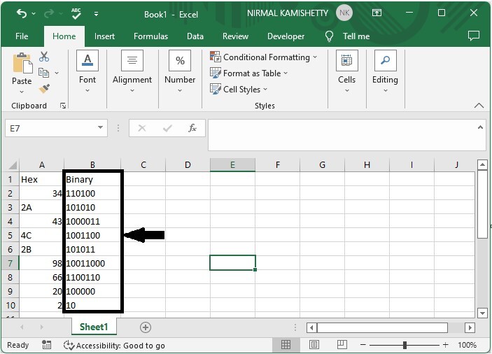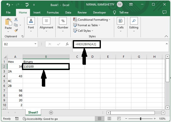 要將十六進位制數轉換為二進位制數,請單擊一個空單元格(在本例中為單元格 B2),然後輸入公式 =HEX2BIN(A2),然後按 Enter 鍵以獲得我們的第一個結果,如下面的影像所示。