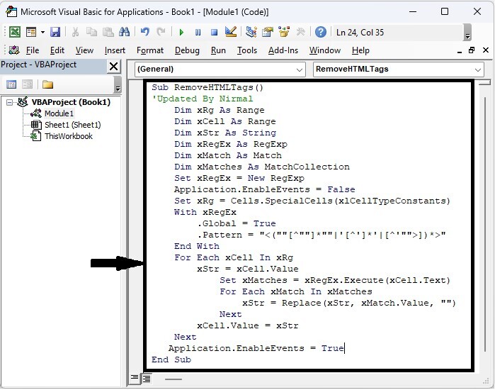 Sub RemoveHTMLTags() 'Updated By Nirmal Dim xRg As Range Dim xCell As Range Dim xStr As String Dim xRegEx As RegExp Dim xMatch As Match Dim xMatches As MatchCollection Set xRegEx = New RegExp Application.EnableEvents = False Set xRg = Cells.SpecialCells(xlCellTypeConstants) With xRegEx .Global = True .Pattern = "<(""[^""]*""|'[^']*'|[^'"">])*>" End With For Each xCell In xRg xStr = xCell.Value Set xMatches = xRegEx.Execute(xCell.Text) For Each xMatch In xMatches xStr = Replace(xStr, xMatch.Value, "") Next xCell.Value = xStr Next Application.EnableEvents = True End Sub