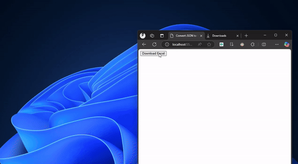 <!DOCTYPE html> <html lang="en"> <head> <meta charset="UTF-8"> <meta name="viewport" content="width=device-width, initial-scale=1.0"> <title>Convert JSON to Excel</title> <script src= "https://cdnjs.cloudflare.com/ajax/libs/xlsx/0.18.5/xlsx.full.min.js"> </script> </head> <body> <button onclick="convertJsonToExcel()"> Download Excel </button> <script> function convertJsonToExcel() { // JSON data to be converted const jsonData = [ { "Name": "Amit Kumar", "Age": 29, "City": "Mumbai" }, { "Name": "Priya Sharma", "Age": 25, "City": "Delhi" }, { "Name": "Ravi Patel", "Age": 35, "City": "Ahmedabad" }, { "Name": "Anjali Verma", "Age": 28, "City": "Pune" } ]; // Convert JSON to worksheet const worksheet = XLSX.utils.json_to_sheet(jsonData); // Create a new workbook and add the worksheet const workbook = XLSX.utils.book_new(); XLSX.utils.book_append_sheet(workbook, worksheet, "Sheet1"); // Export the Excel file XLSX.writeFile(workbook, "data.xlsx"); } </script> </body> </html>