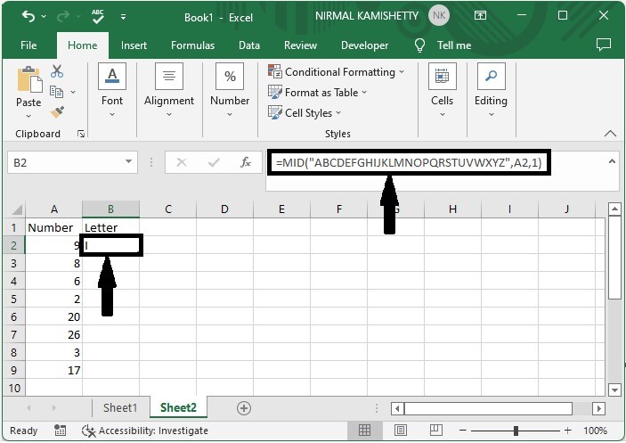 =MID("ABCDEFGHIJKLMNOPQRSTUVWXYZ",A2,1) 並點選 Enter 以獲得我們的第一個結果。