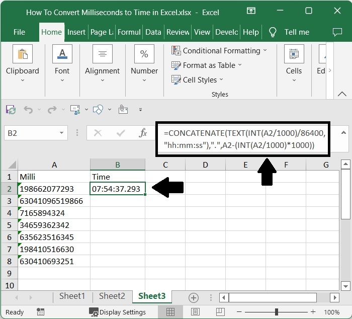 =CONCATENATE(TEXT(INT(A2/1000)/86400,"hh:mm:ss"),".",A2-(INT(A2/1000)*1000)) 並單擊Enter鍵以獲得我們的第一個結果,它看起來類似於下圖。在公式中,A2是Excel表格中我們值的地址。
