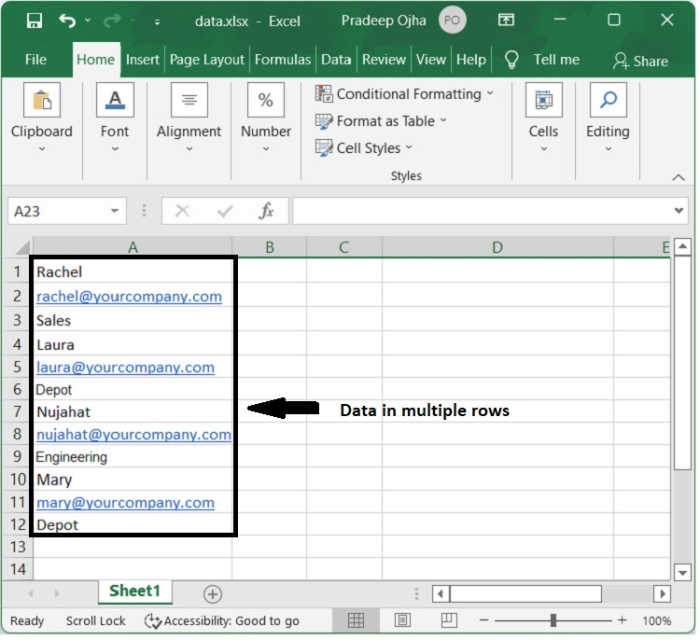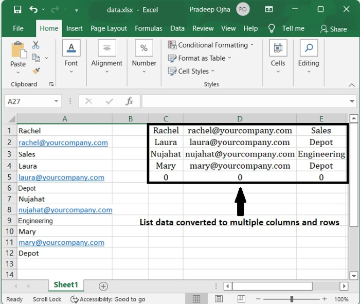 讓我們考慮以下多行資料的列表,並嘗試使用 Excel 公式將其轉換為多列和多行。