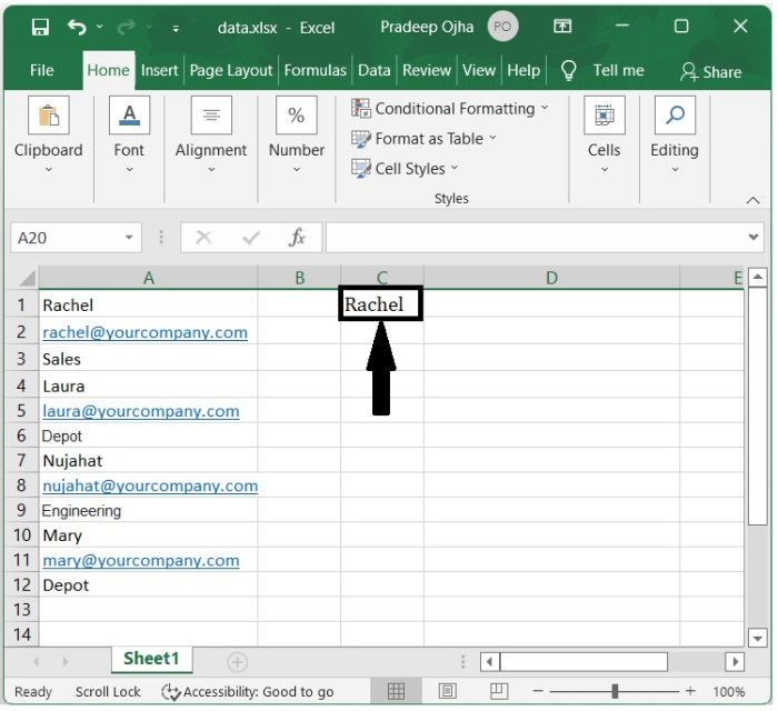 現在,我們將在單元格 C1 中獲得資料列表的第一行資料,如下面的影像所示。