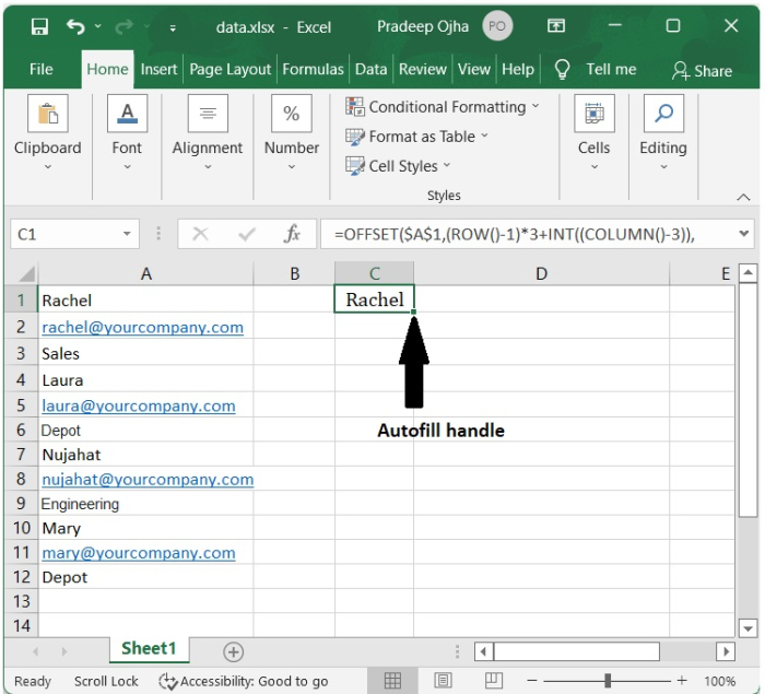 要將所有列表資料轉換為多列和多行,我們只需從單元格 C1 拖動自動填充柄即可。