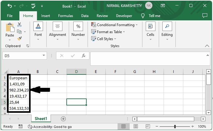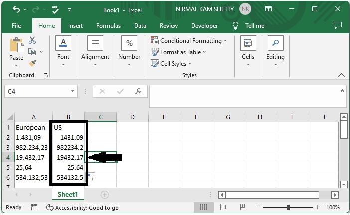 在這裡,我們將使用 NUMBERVALUE 公式獲取任何一個結果,然後使用自動填充柄獲取所有結果。讓我們來看一下在 Excel 中轉換歐洲和美國之間數字格式的簡單過程。