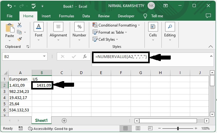 要獲取第一個結果,請單擊一個空單元格,在本例中為單元格 B2,然後輸入公式=NUMBERVALUE(A2, "," ,"." )並按 Enter 鍵。在公式中,A2 是表格中值的地址。