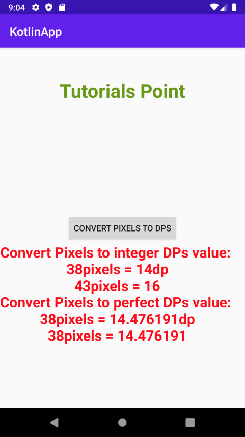 <?xml version="1.0" encoding="utf-8"?> <RelativeLayout xmlns:android="http://schemas.android.com/apk/res/android" xmlns:tools="http://schemas.android.com/tools" android:layout_width="match_parent" android:layout_height="match_parent" tools:context=".MainActivity"> <TextView android:layout_width="wrap_content" android:layout_height="wrap_content" android:layout_centerHorizontal="true" android:layout_marginTop="50dp" android:text="Tutorials Point" android:textAlignment="center" android:textColor="@android:color/holo_green_dark" android:textSize="32sp" android:textStyle="bold" /> <Button android:id="@+id/button" android:layout_width="wrap_content" android:layout_height="wrap_content" android:layout_centerInParent="true" android:text="Convert Pixels to DPs" /> <TextView android:id="@+id/textView" android:layout_width="wrap_content" android:layout_height="wrap_content" android:layout_below="@id/button" android:textAlignment="center" android:textColor="#ff0000" android:textSize="24sp" android:textStyle="bold" /> </RelativeLayout>