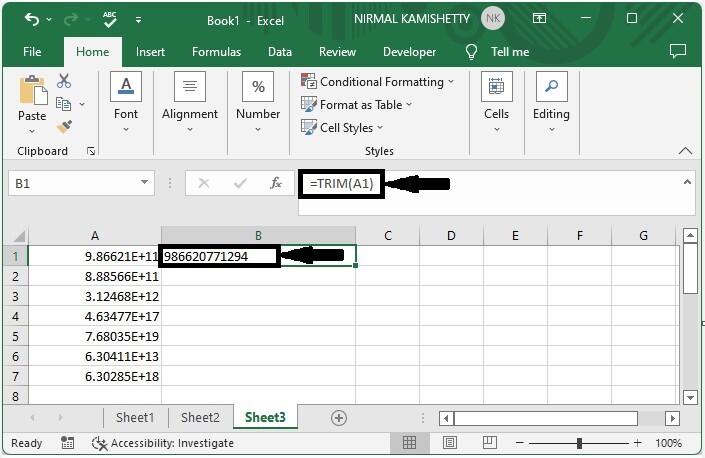 在這裡,我們將首先使用TRIM公式獲取任何一個結果,然後使用自動填充柄獲取所有結果。讓我們來看一下在Excel中使用TRIM函式將科學計數法轉換為文字的簡單步驟。