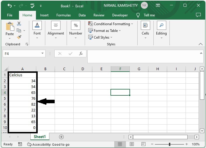 讓我們考慮一個Excel表格,其中包含類似於下圖所示的攝氏溫度列表。