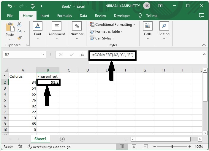 要將攝氏度轉換為開爾文,我們可以使用公式=CONVERT(A2,"C","K")。