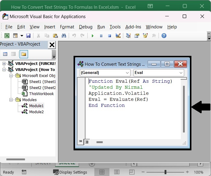 在這種情況下,我們首先將開啟 VB 應用程式,然後插入帶有程式碼的模組,執行它,並使用建立的 eval 公式完成過程。