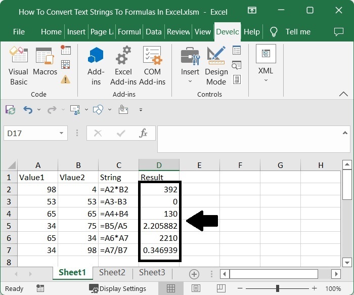 然後,使用 Alt + Q 命令將工作表另存為啟用宏的工作簿並退出 vba 應用程式。然後,在我們的例子中,單元格 D2,單擊一個空單元格,輸入公式 =eval(C2),然後按 Enter 以獲得我們的第一個結果,如下面的影像所示。在公式中,C2 是工作表上字串的地址。