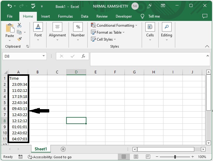 考慮一個 Excel 工作表,其中資料以時間列表的形式顯示,如下面的影像所示。